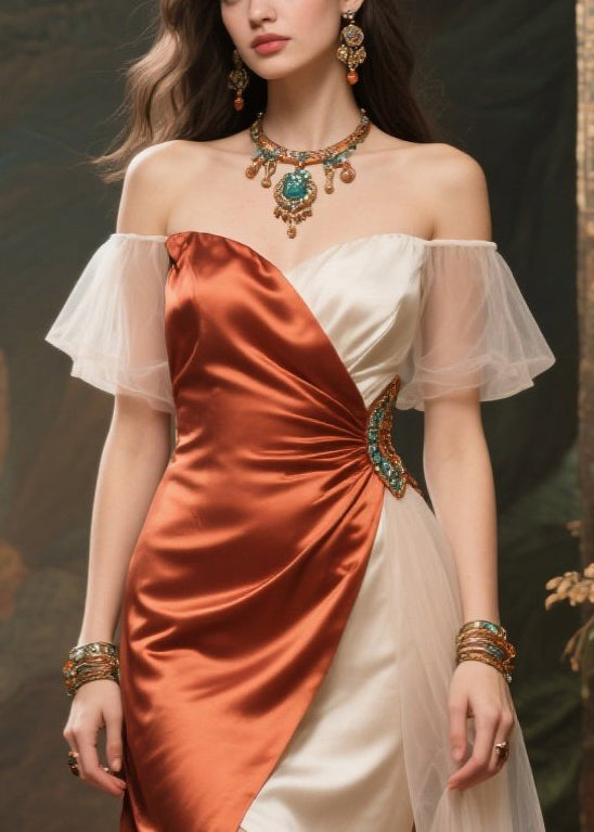 Elegant Colorblock Backless Patchwork Side Open Silk Dinner Dress Summer