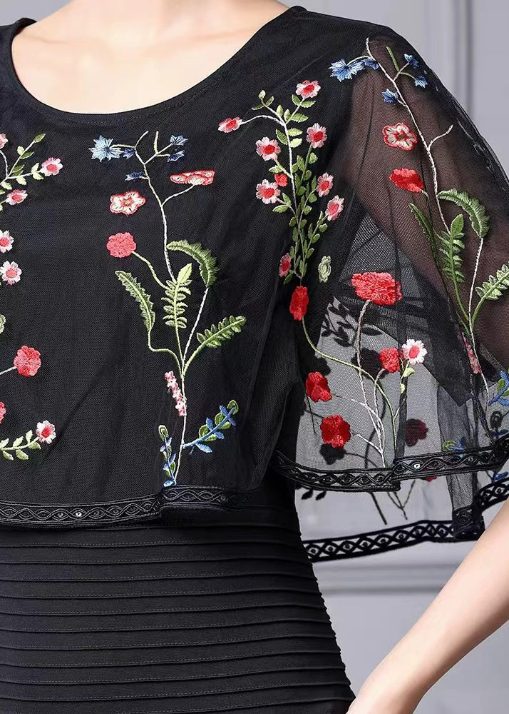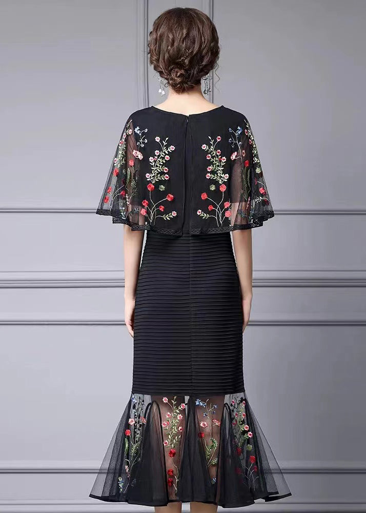 Fine Black Cape Style Dresses Multicolor Floral Embroidered Summer