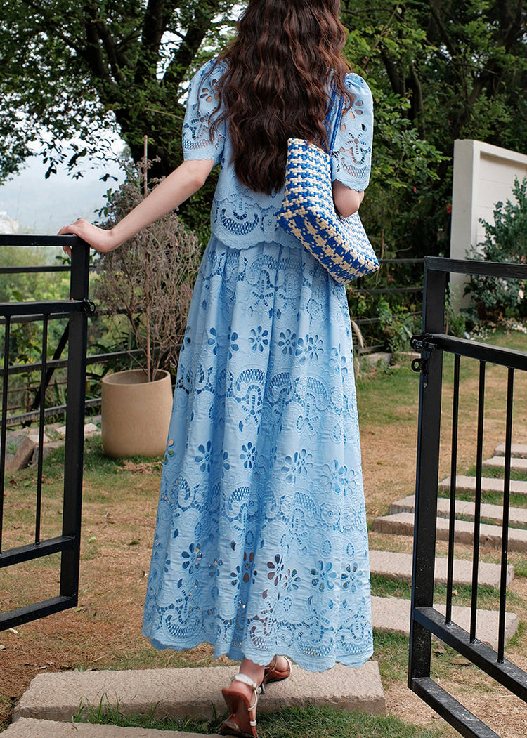 Fine Blue Embroidered Hollow Out Two Piece Set Summer