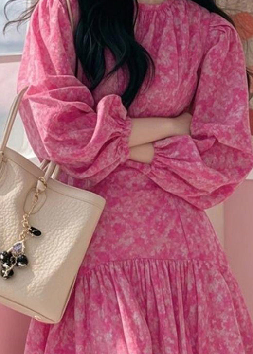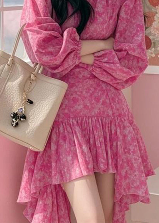 French Rose Ruffled Asymmetrical Design Print Chiffon Dress Fall