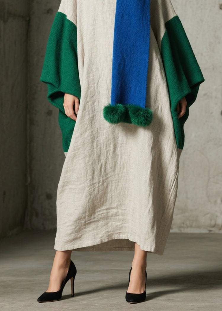 Loose Colorblock Patchwork Cotton Ankle Dress Batwing Sleeve