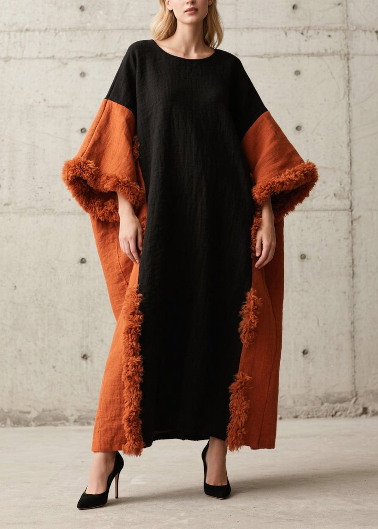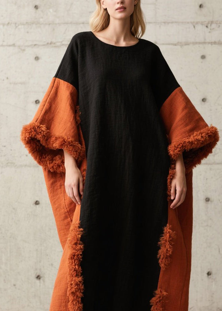 New Colorblock O Neck Fuzzy Fur Patchwork Cotton Long Dress Fall
