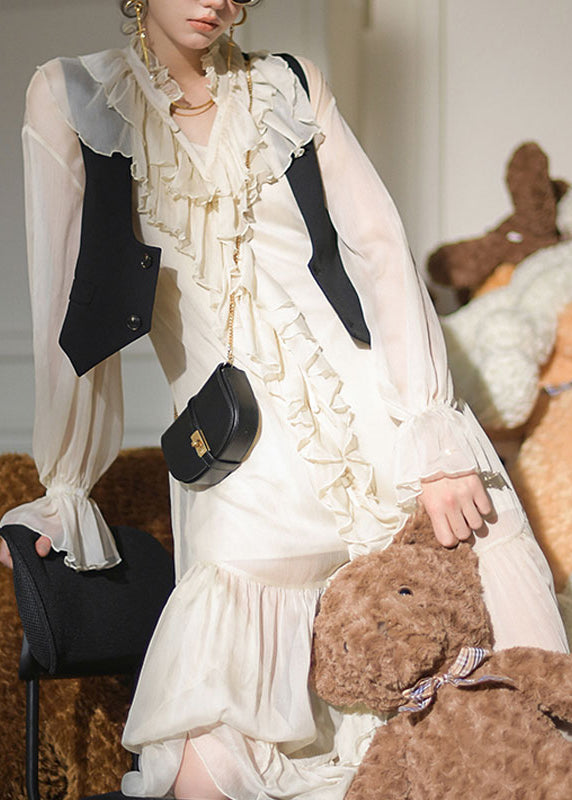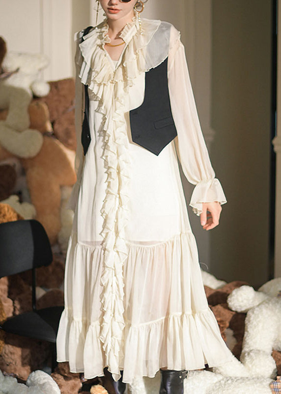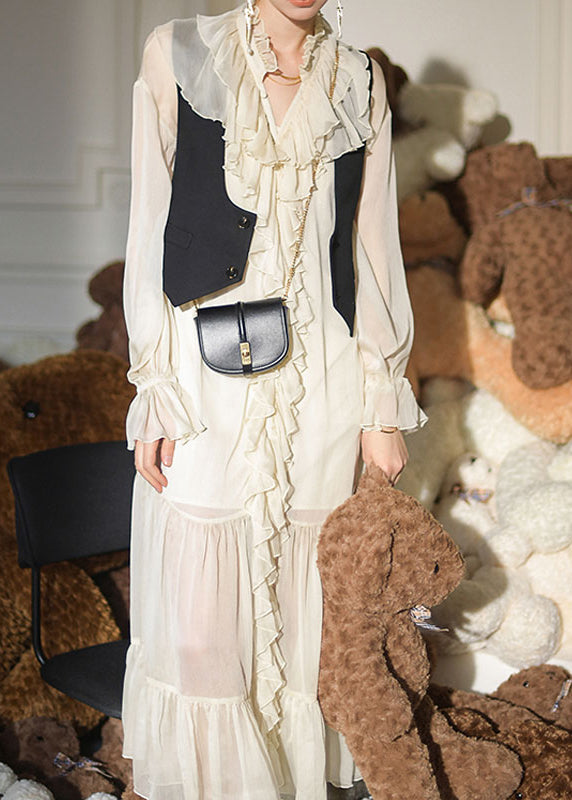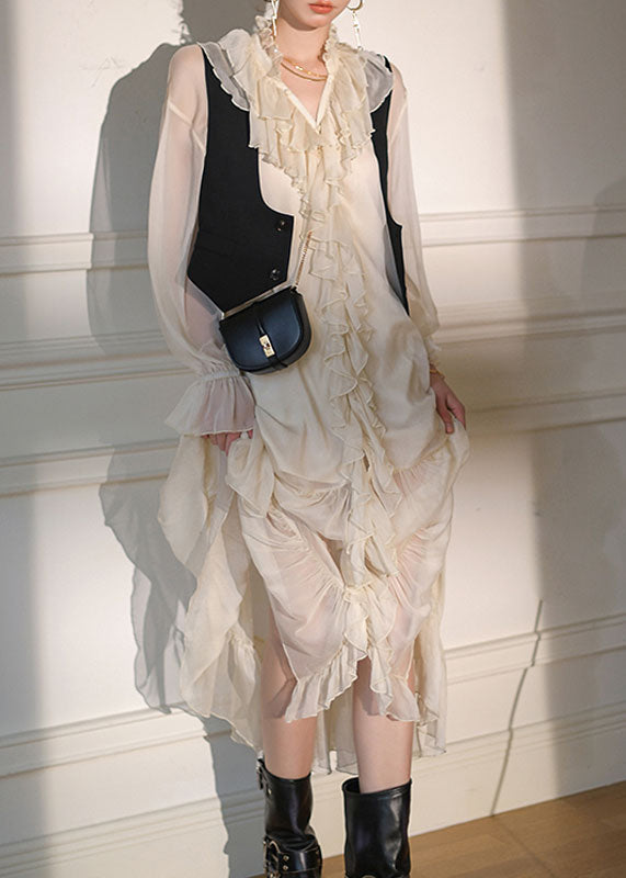 Style Beige Ruffled Patchwork Chiffon Dress Long Sleeve