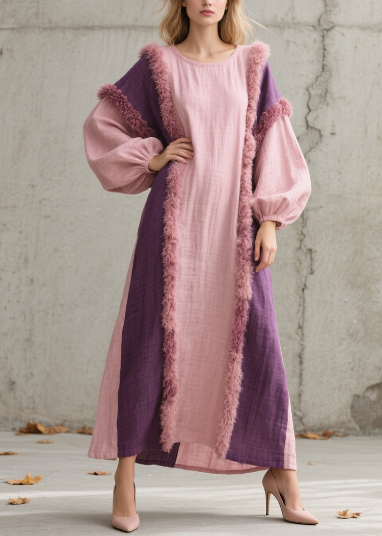 Stylish Colorblock O Neck Fuzzy Fur Patchwork Cotton Dress Fall