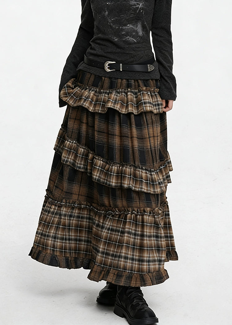 Vintage Coffee Ruffled Plaid Elastic Waist Cotton Skirts Spring