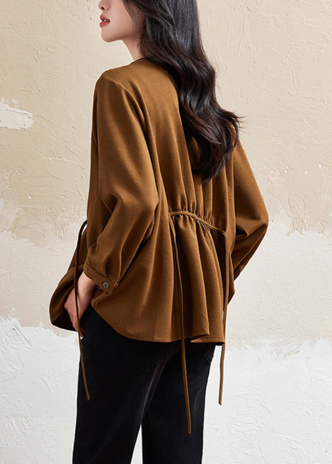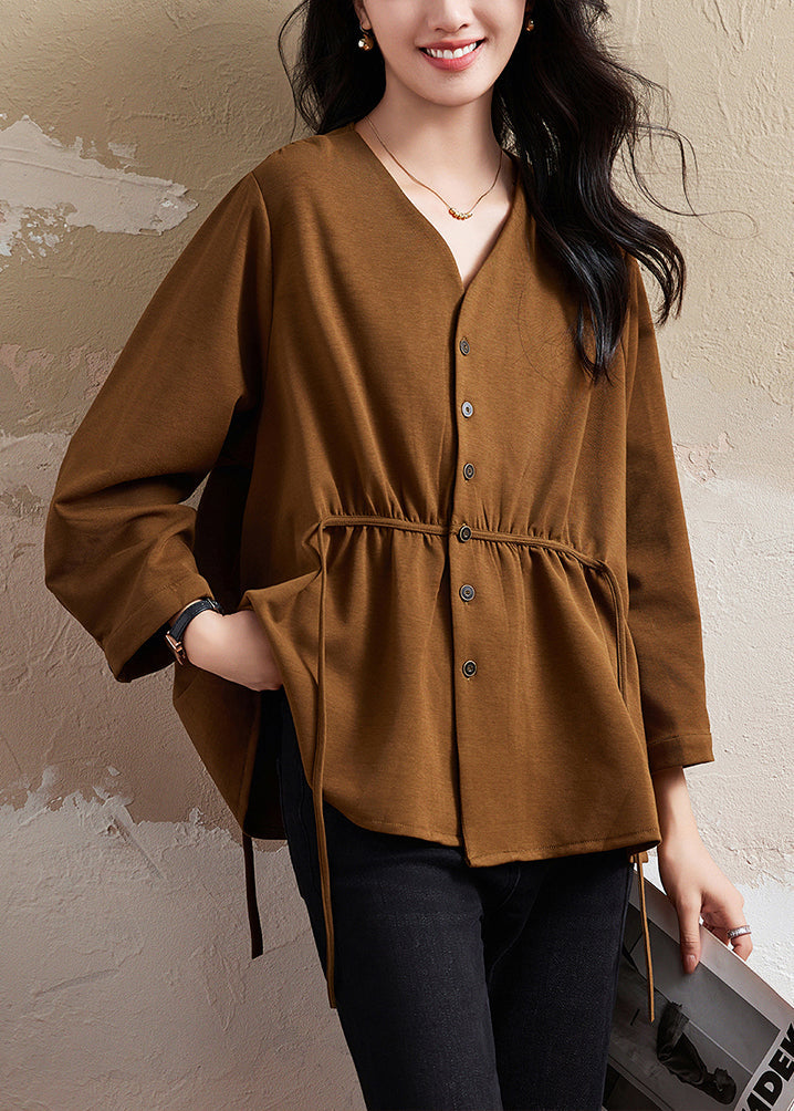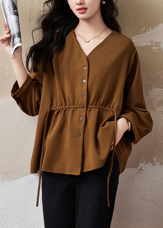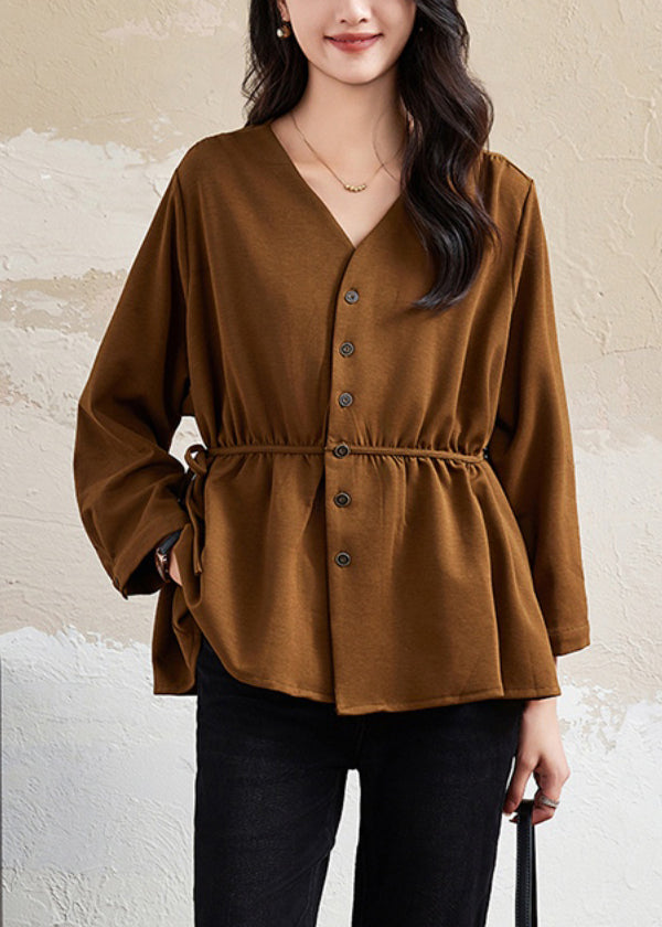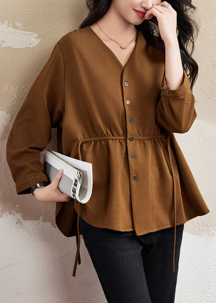 Vintage Coffee V Neck Button Lace Up Cotton Shirt Top Fall