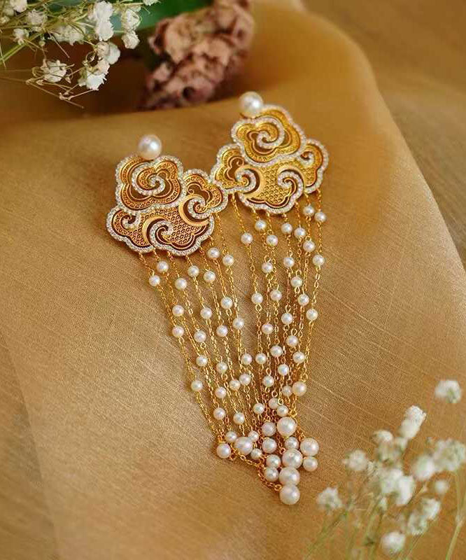 Vintage Gold Sterling Silver Overgild Zircon Auspicious Clouds Pearl Tassel Drop Earrings