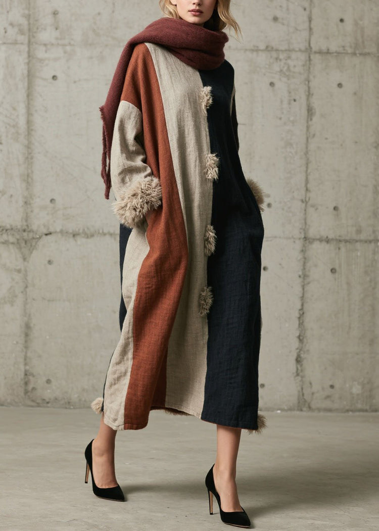 Women Colorblock Fuzzy Fur Fluffy Patchwork Cotton Dress Fall