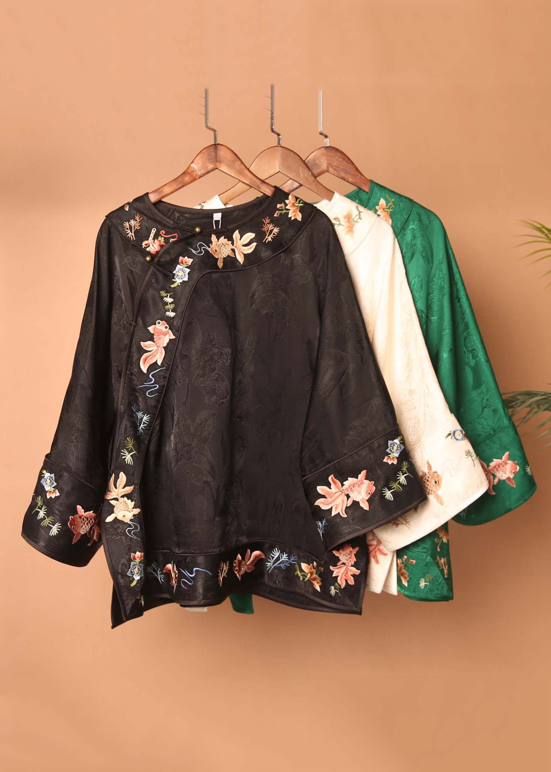 Chinese Style Green Embroidered Button Silk Blouses Fall