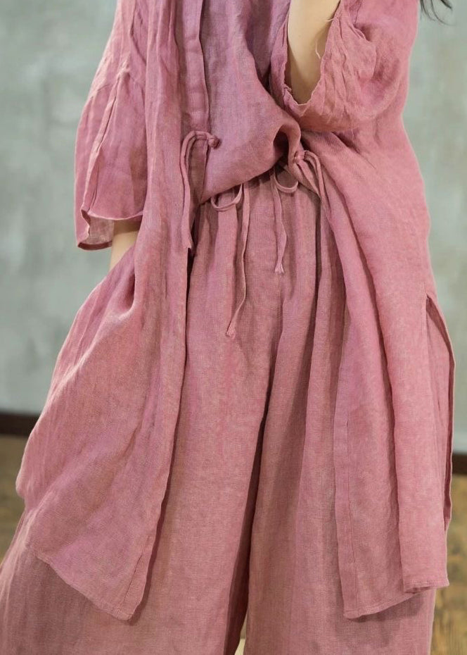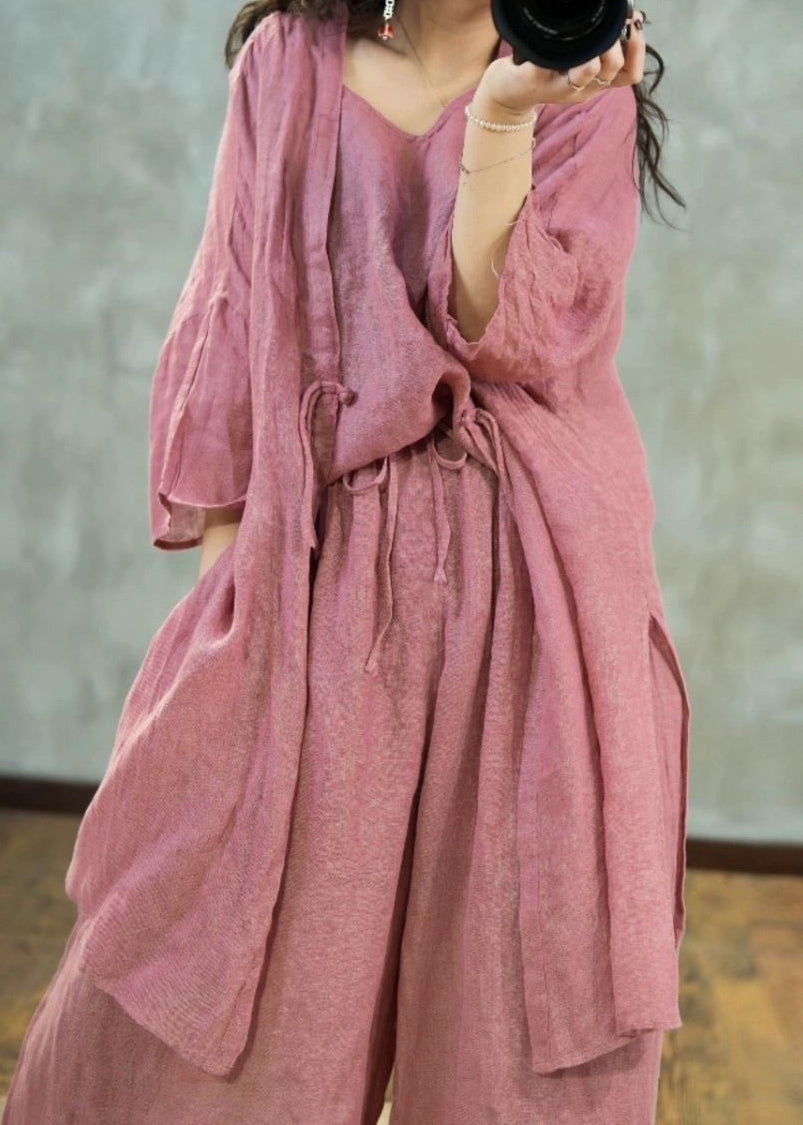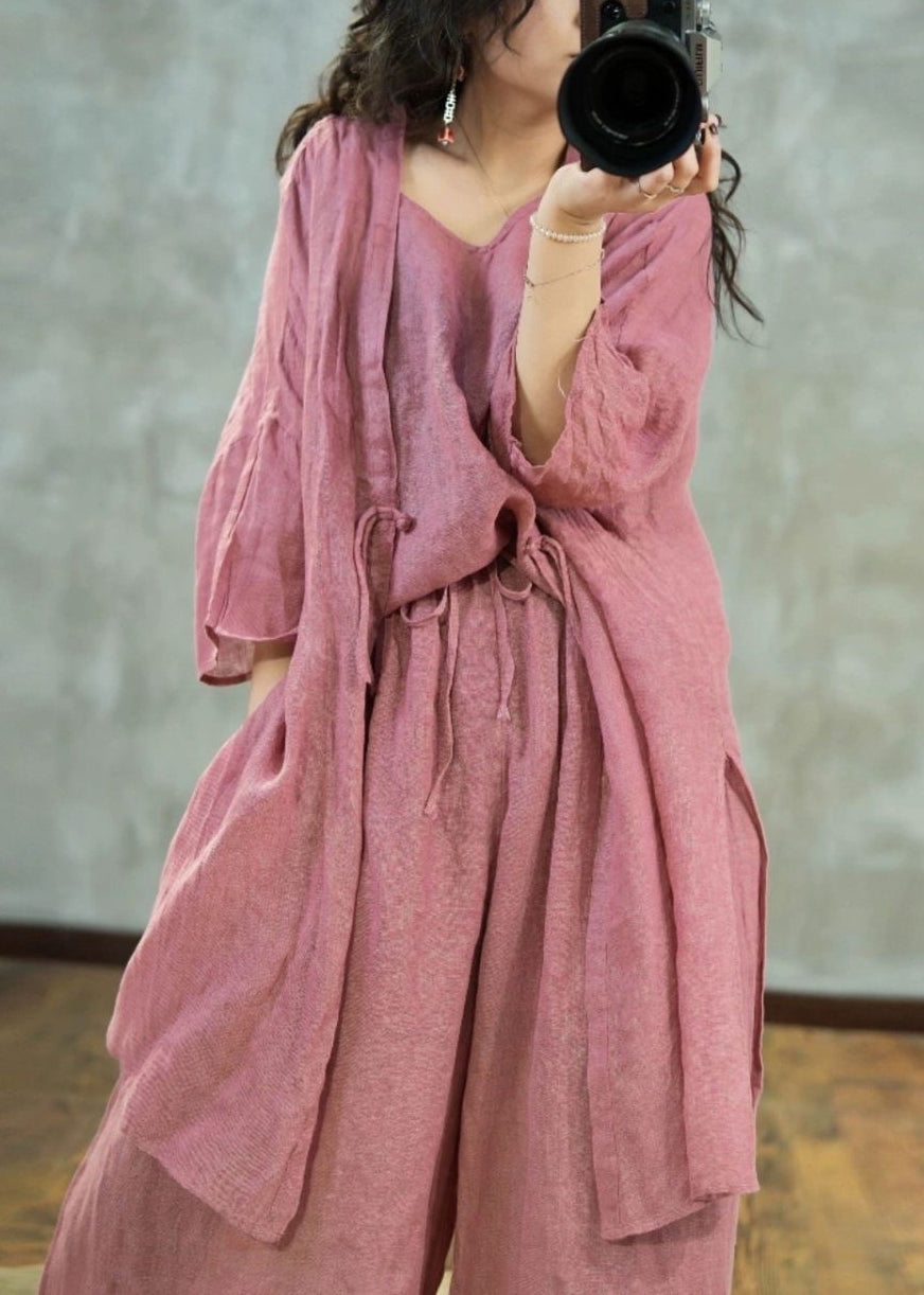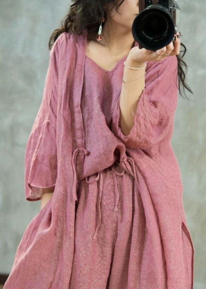 Red Ruffled Pockets Linen Two Pieces Set V Neck Sleeveless