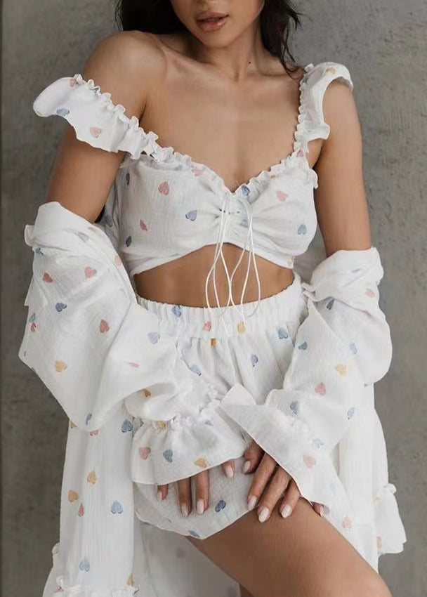 Italian White Ruffled Love Print Cotton Pajamas Two Pieces Set Summer