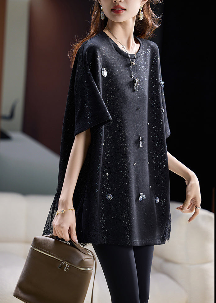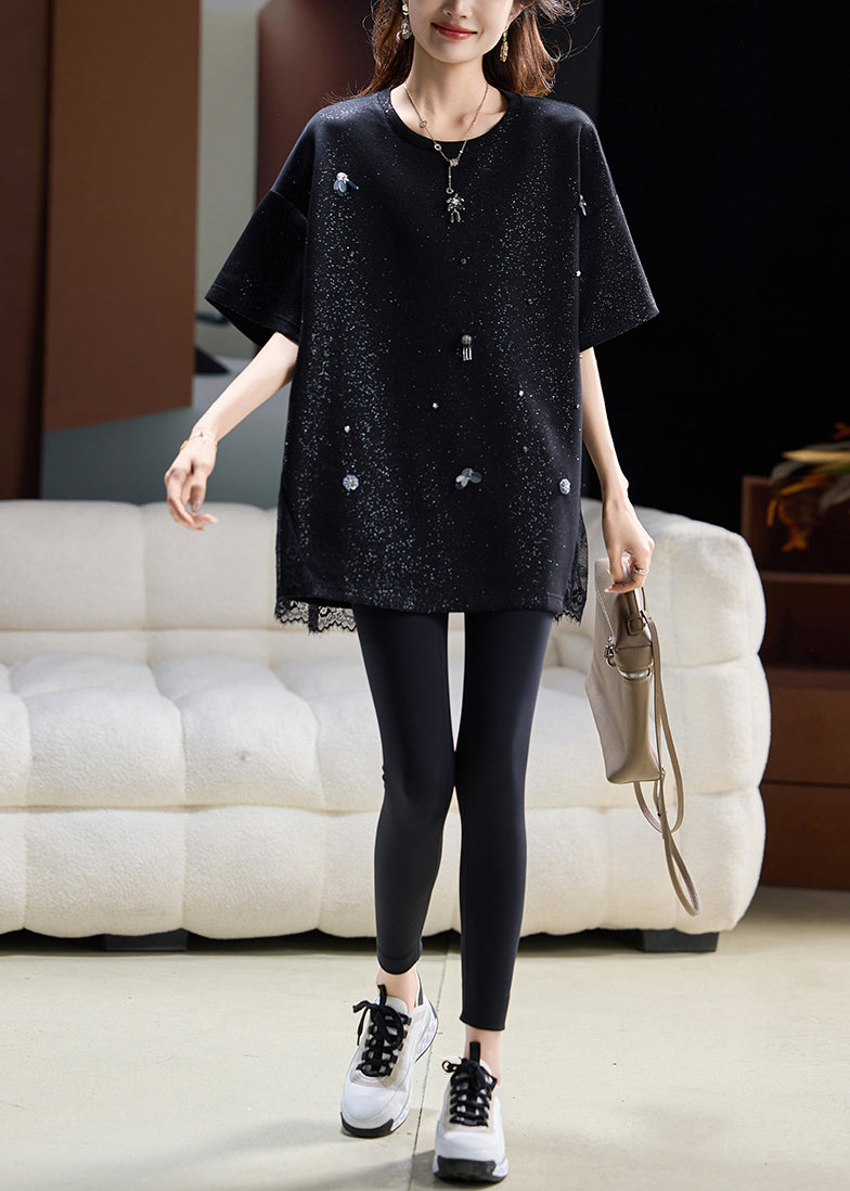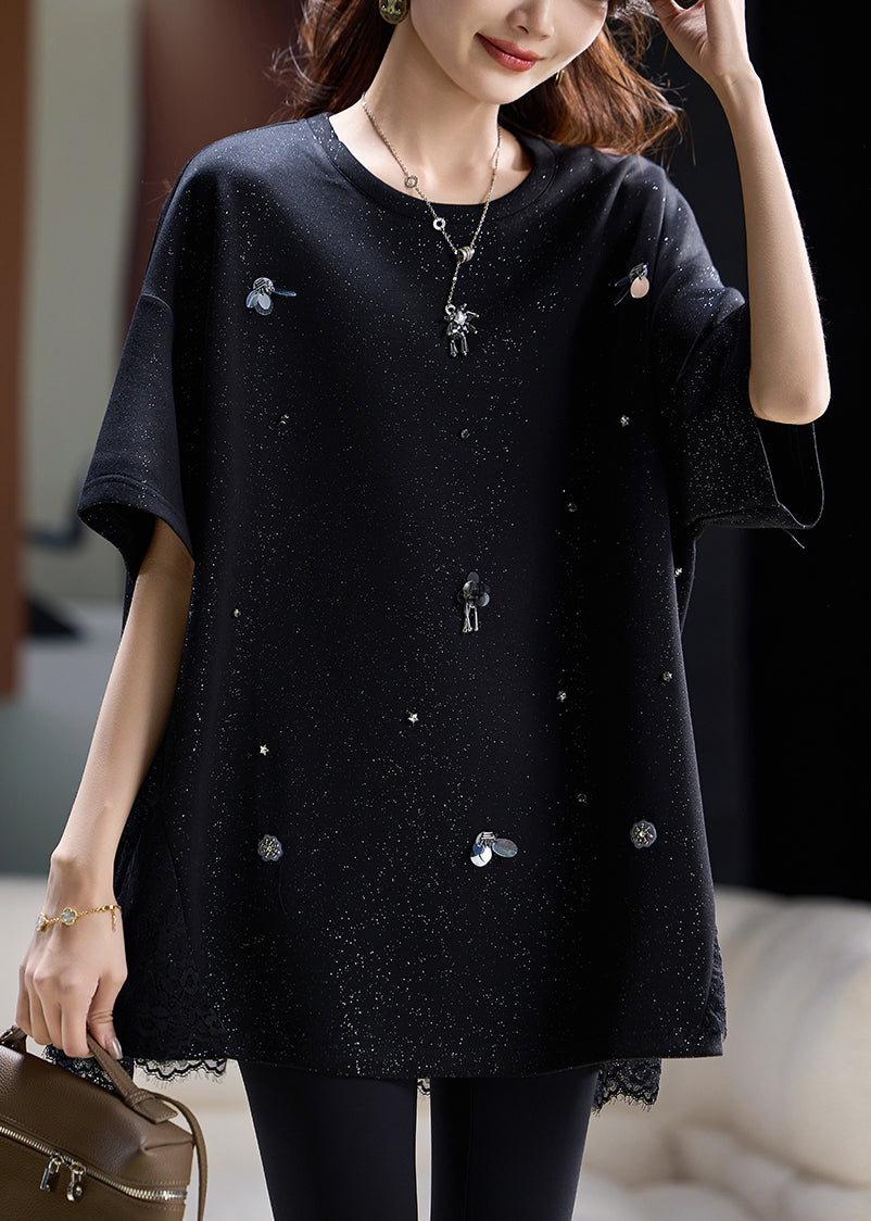 Fine Black Oversized Patchwork Cotton Tops Summer