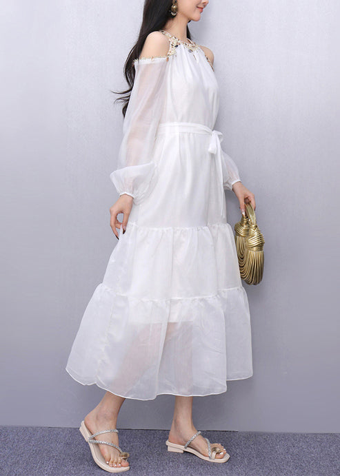 Vintage White Sequins Cold Shoulder Holiday Dress Summer