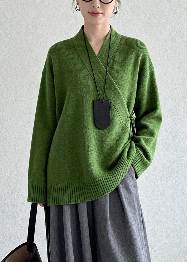 Vintage Tea Green Tie Waist Knit Sweaters Winter