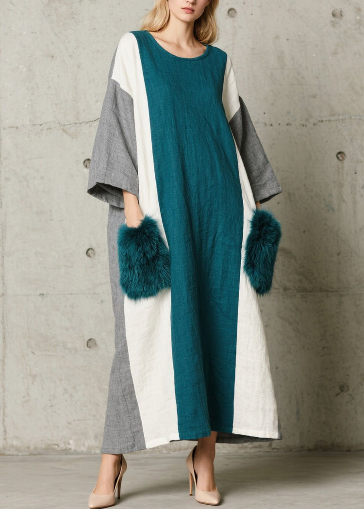 Boho Colorblock O Neck Fuzzy Fur Patchwork Cotton Dress Fall