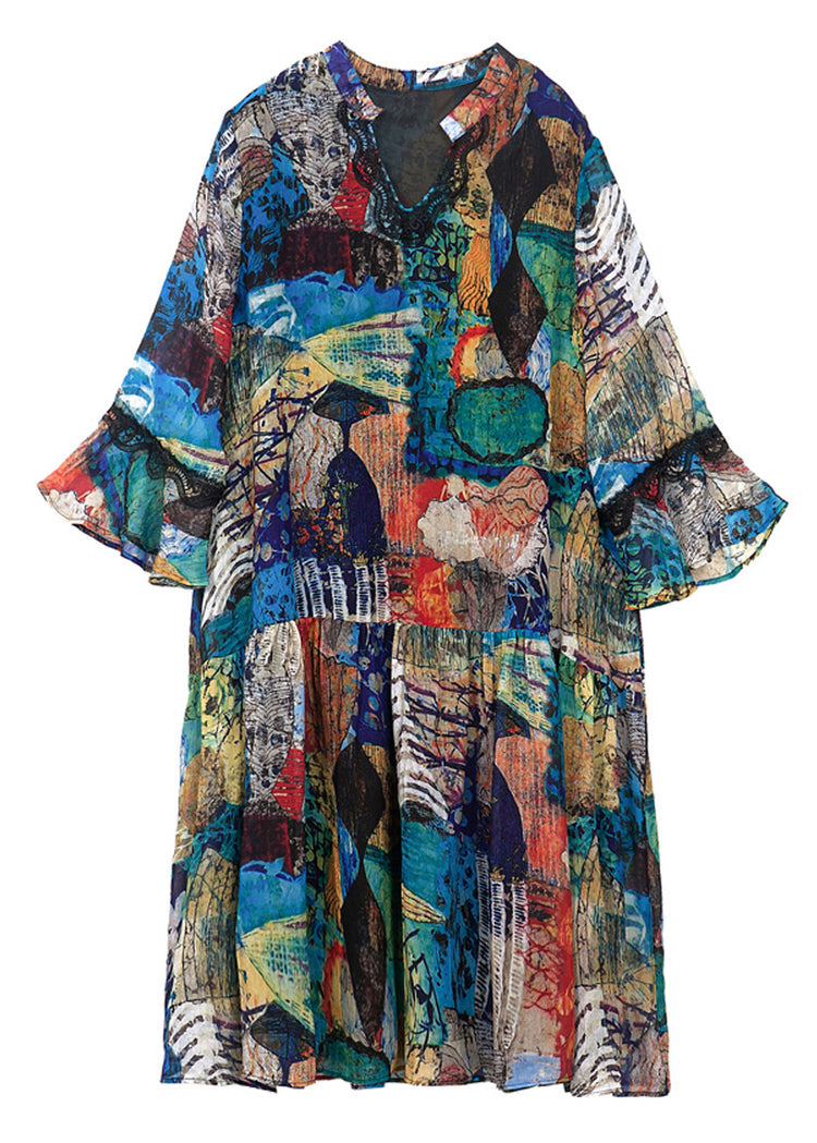 Loose V Neck Print Patchwork Chiffon Maxi Dress Long Sleeve