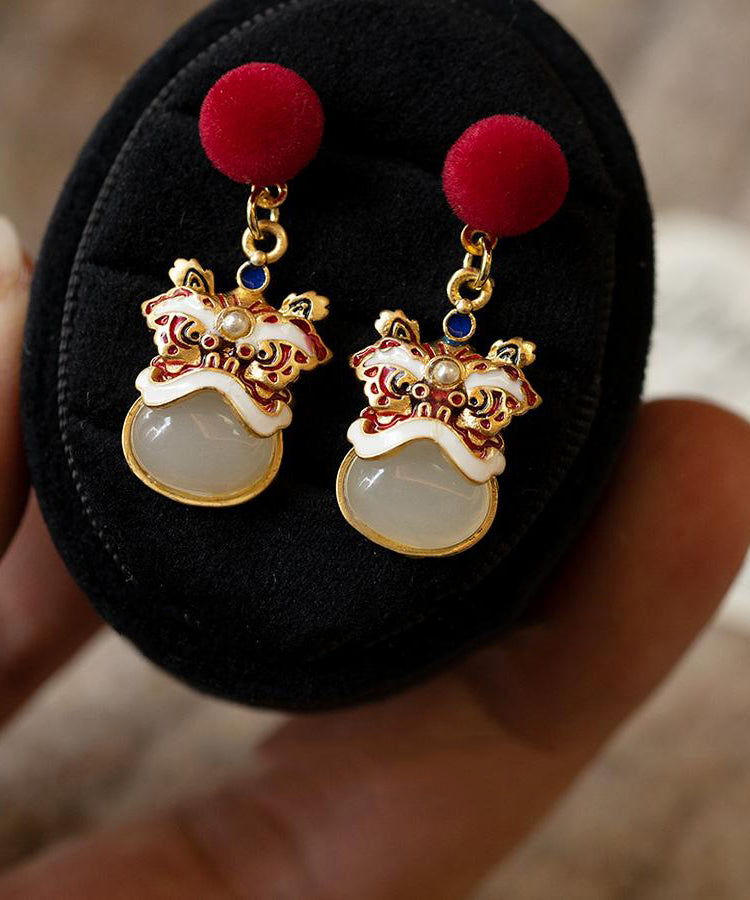 New Year Red Sterling Silver Overgild Lion Dance Drop Earrings