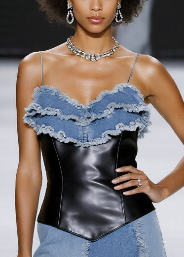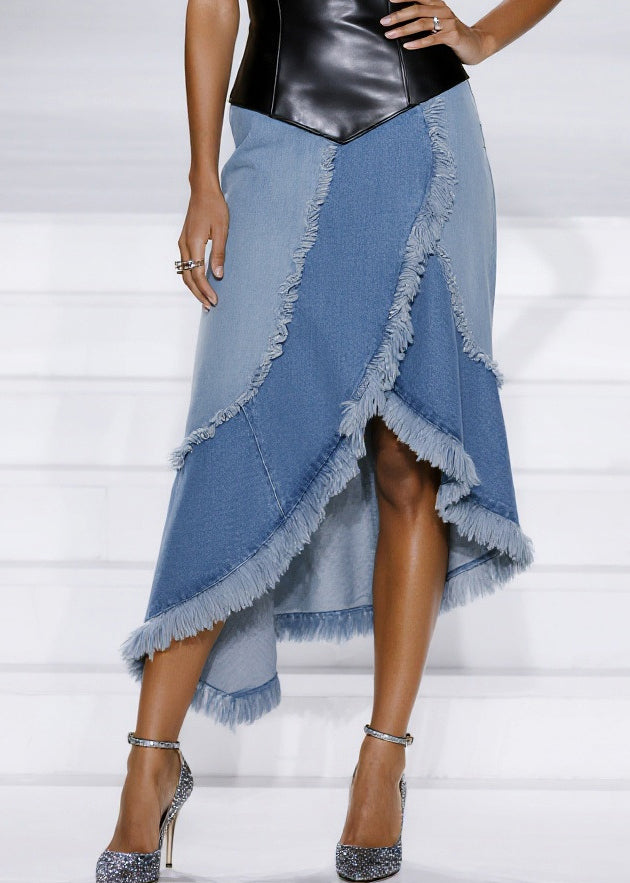 Stylish Blue Tasseled Patchwork Faux Leather Denim Mini Dresses Summer