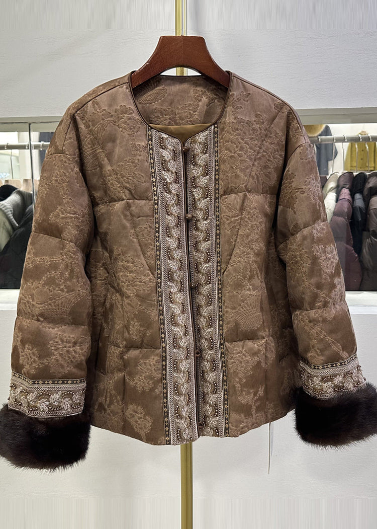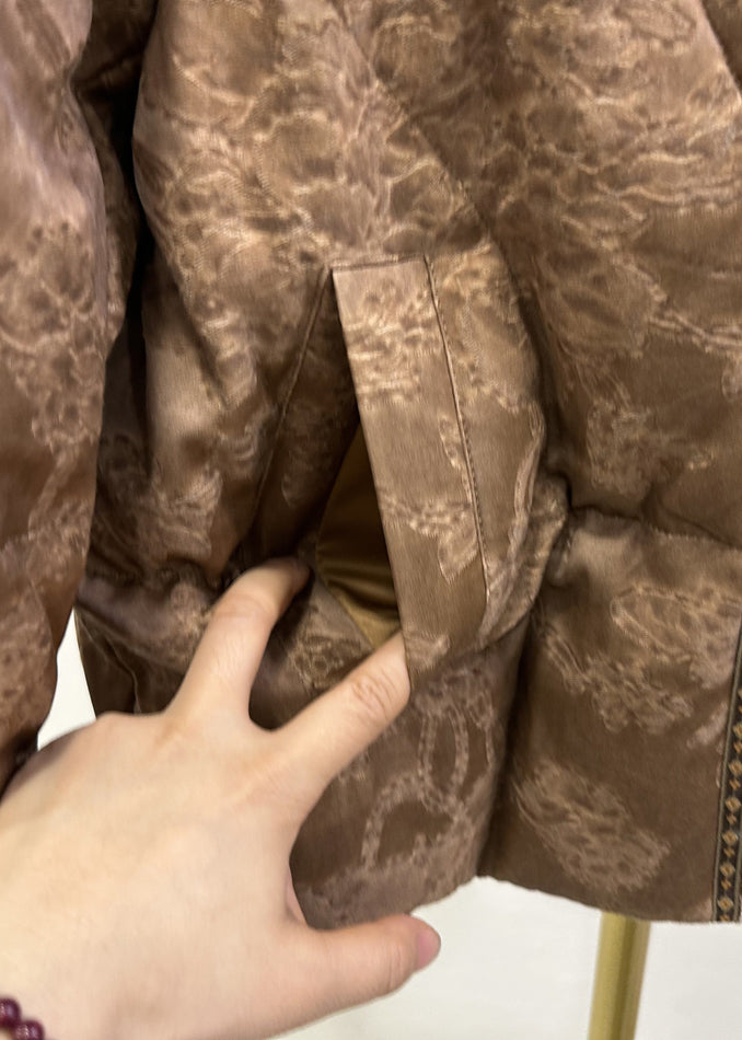 Women Brown Embroidered Jacquard Duck Down Jackets Winter