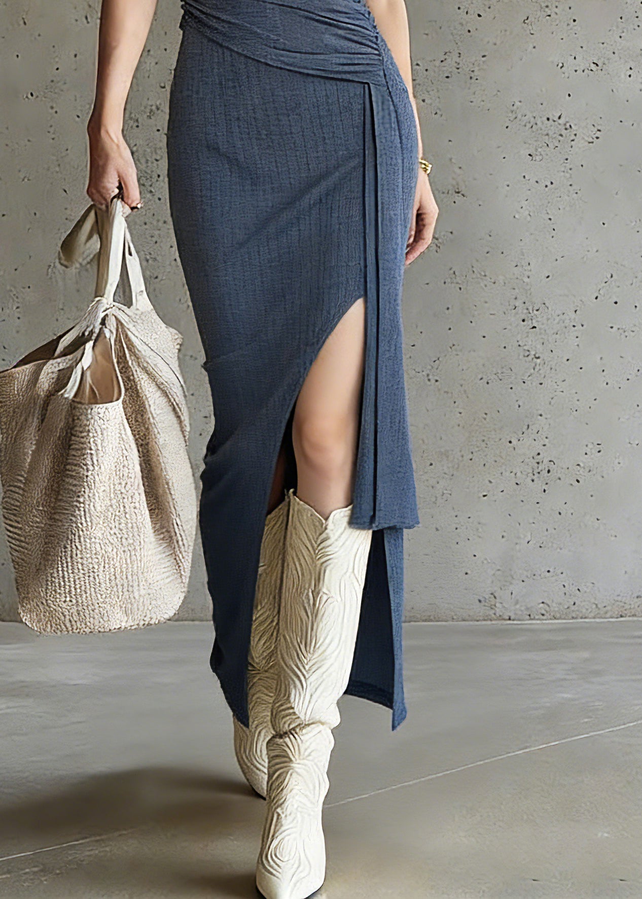 Fitted Blue U Neck Asymmetrical Wrinkled Maxi Dress Sleeveless
