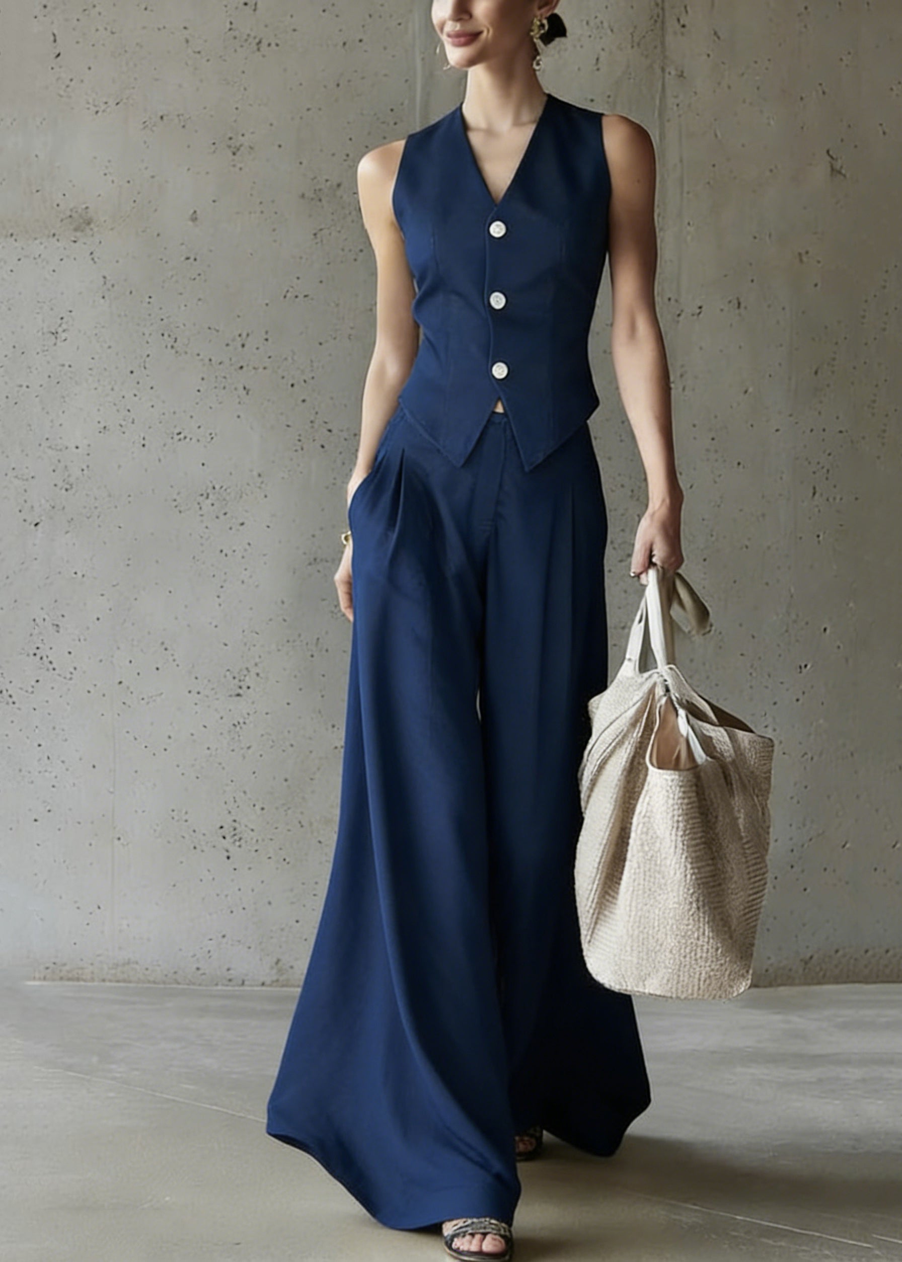 Modern Blue V Neck Button Waistcoat And Wide Leg Pants Two Pieces Set Sleeveless