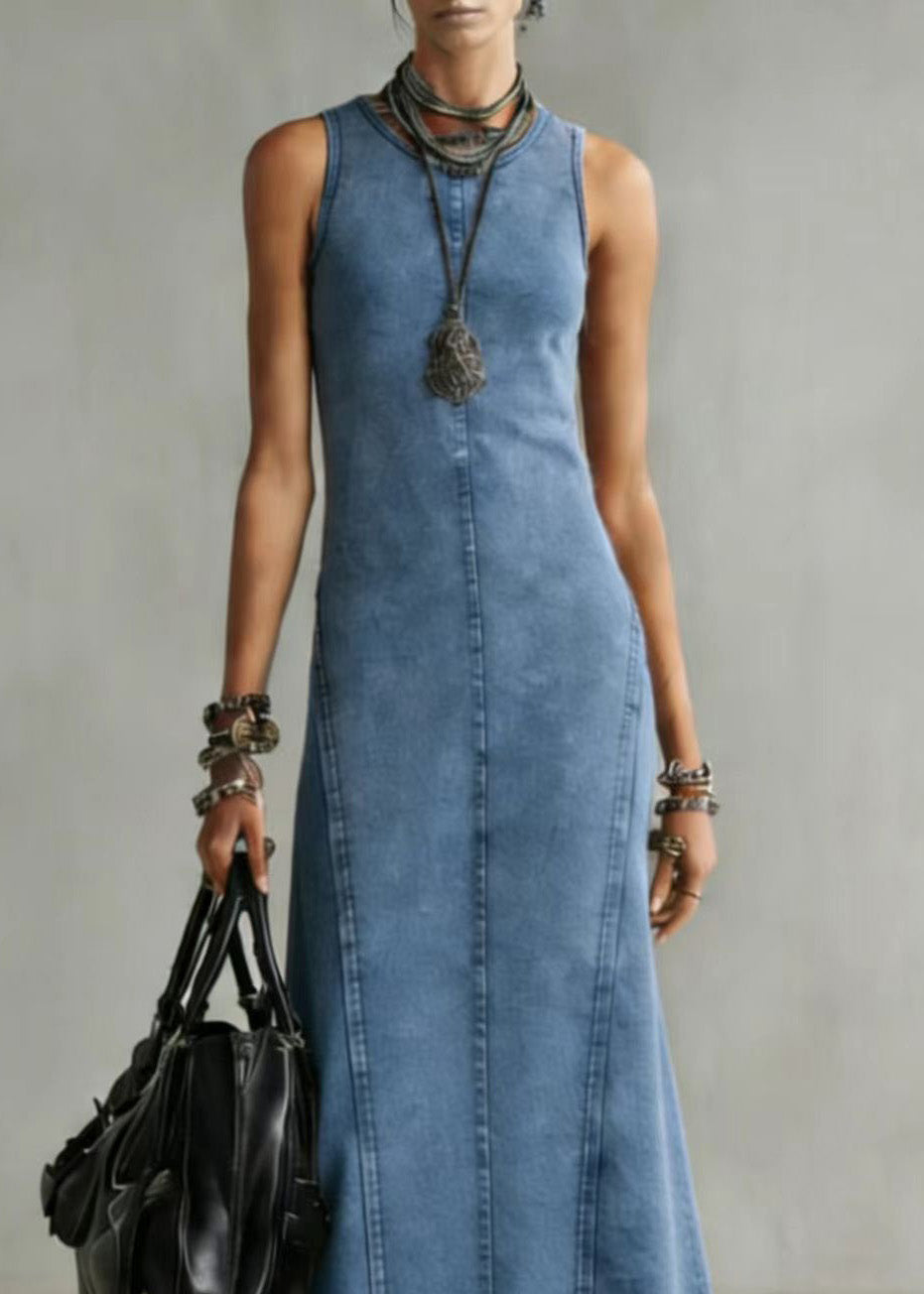 Slim Fit Blue O Neck Denim Long Dress Sleeveless