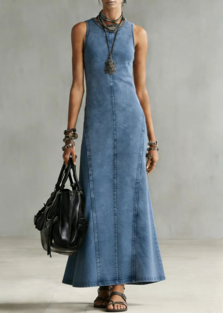 Slim Fit Blue O Neck Denim Long Dress Sleeveless