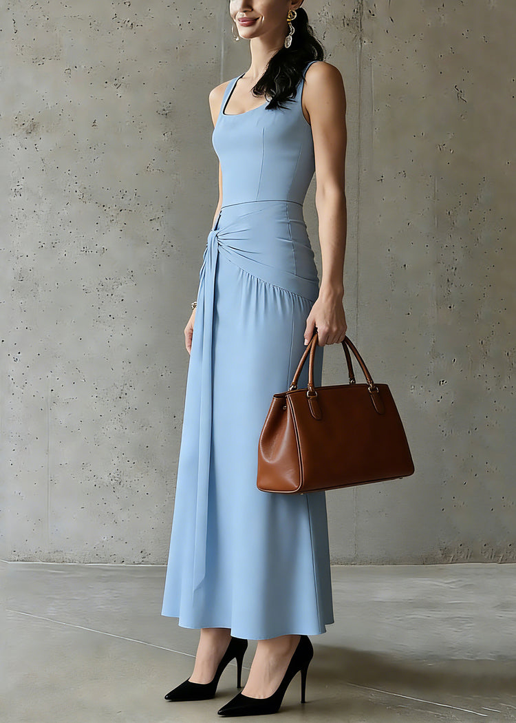 Slim Fit Blue U Neck Patchwork Tie Waist Solid Long Spaghetti Strap Dress Summer