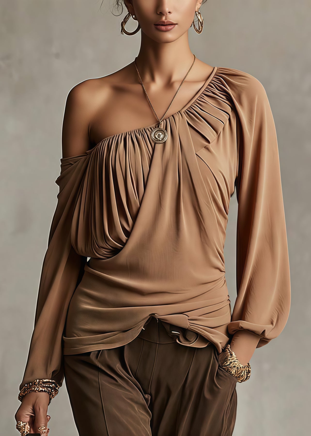 Classy Brown One Shoulder Wrinkled Chiffon Blouse Tops Spring