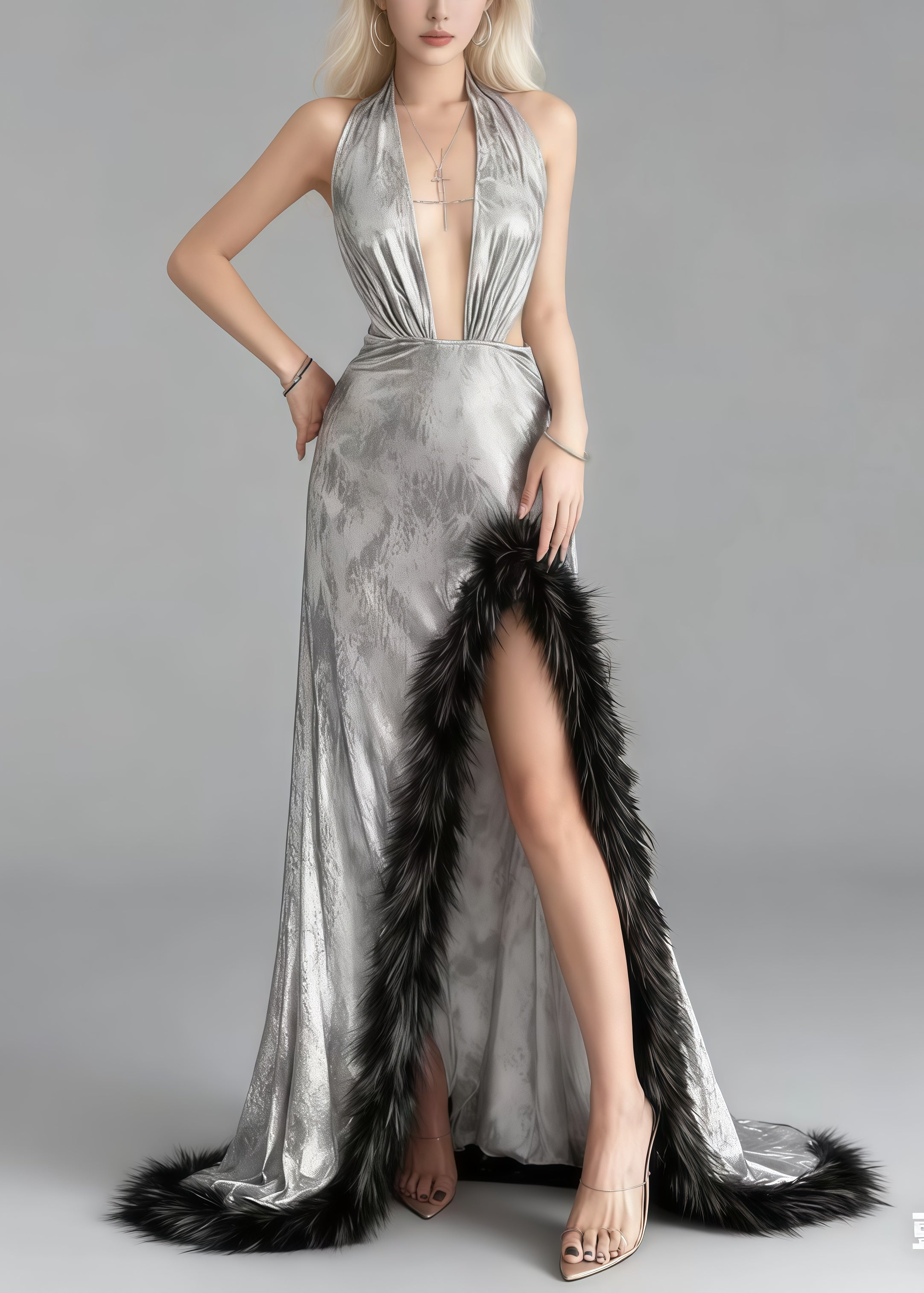 Sexy Silvery Exra Large Hem Patchwork Faux Fur Side Open Evenings Dresses Summer
