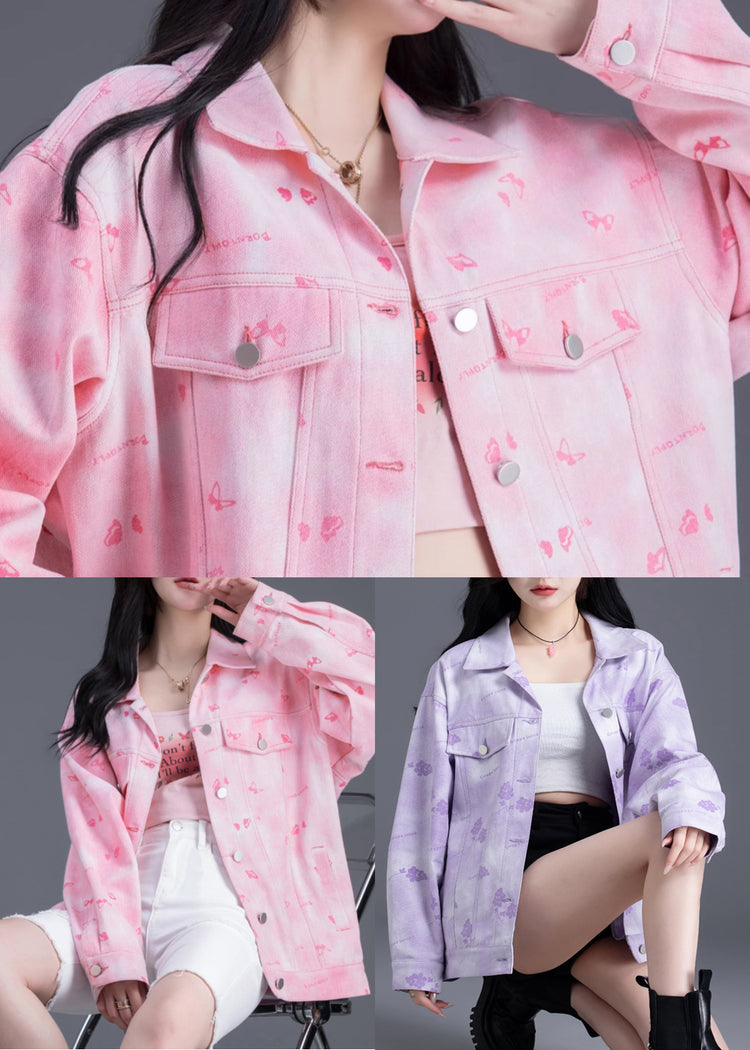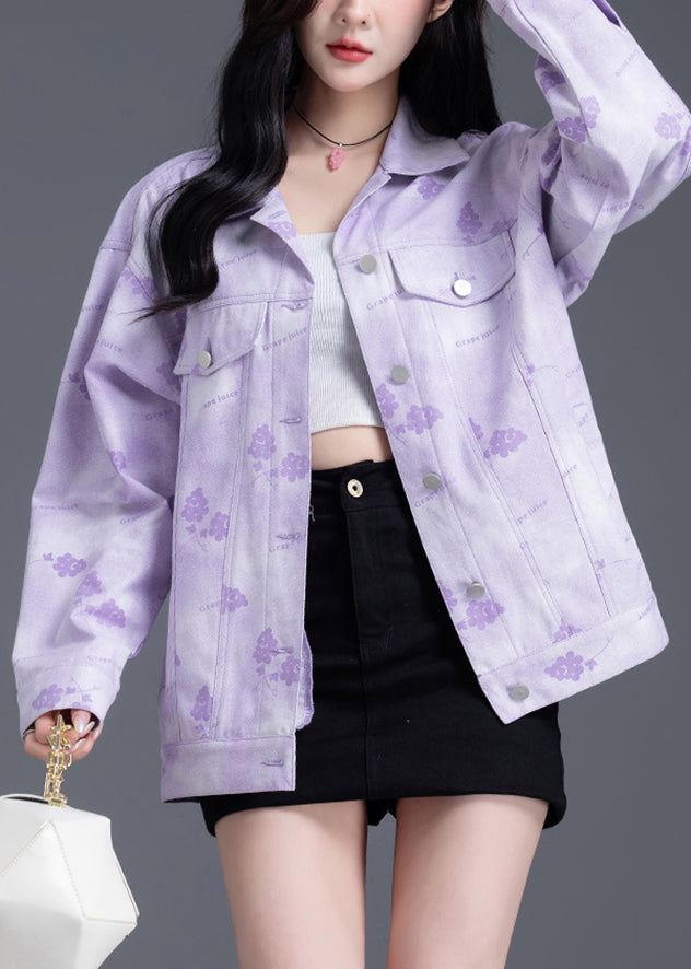 Women Purple Oversized Print Denim Coat Outwear Spring