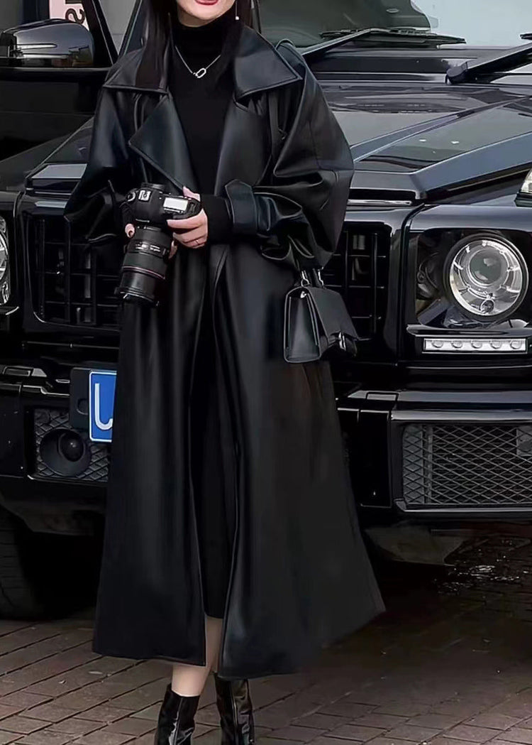 Chic Black Peter Pan Collar Pockets Faux Leather Trench Spring