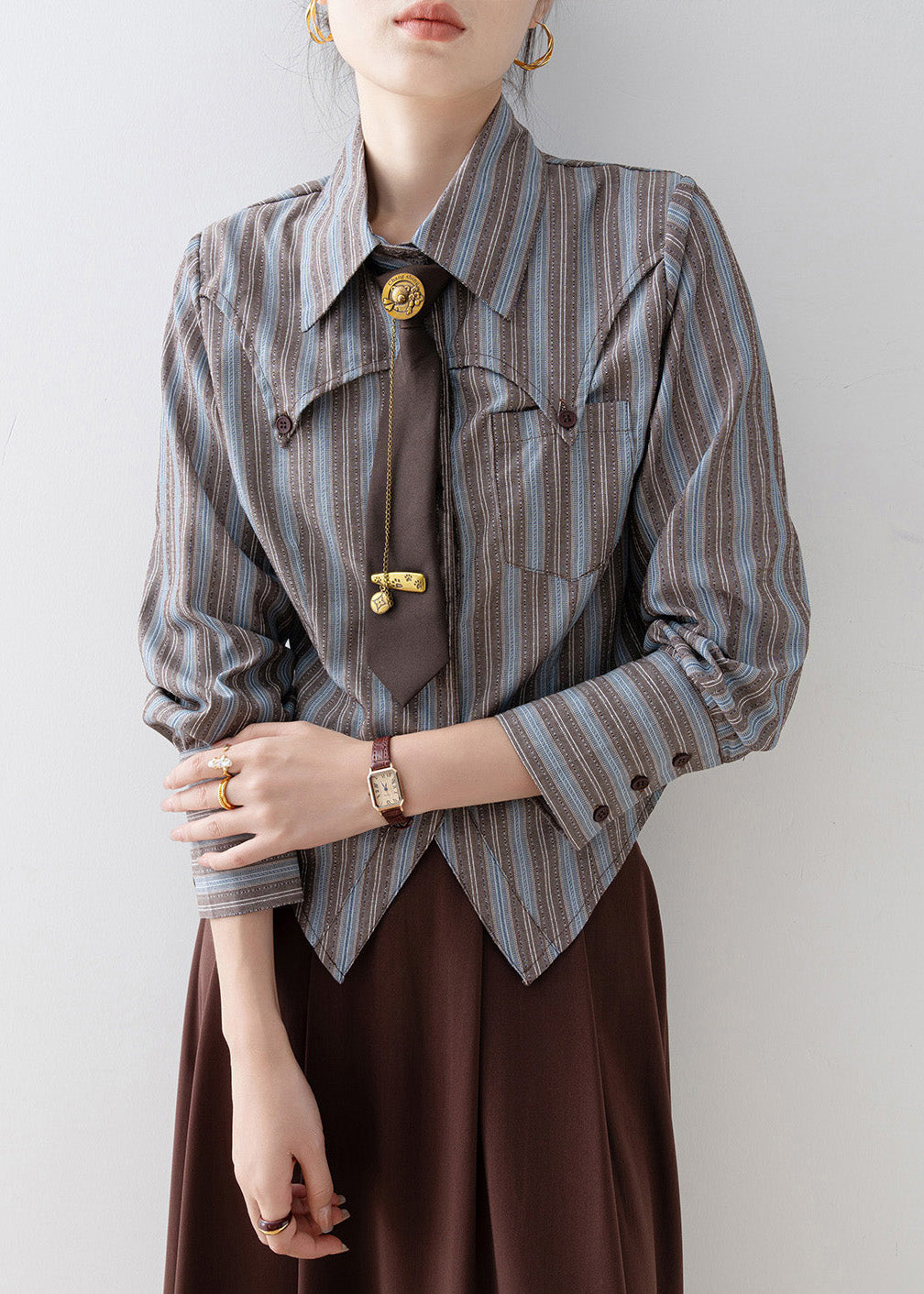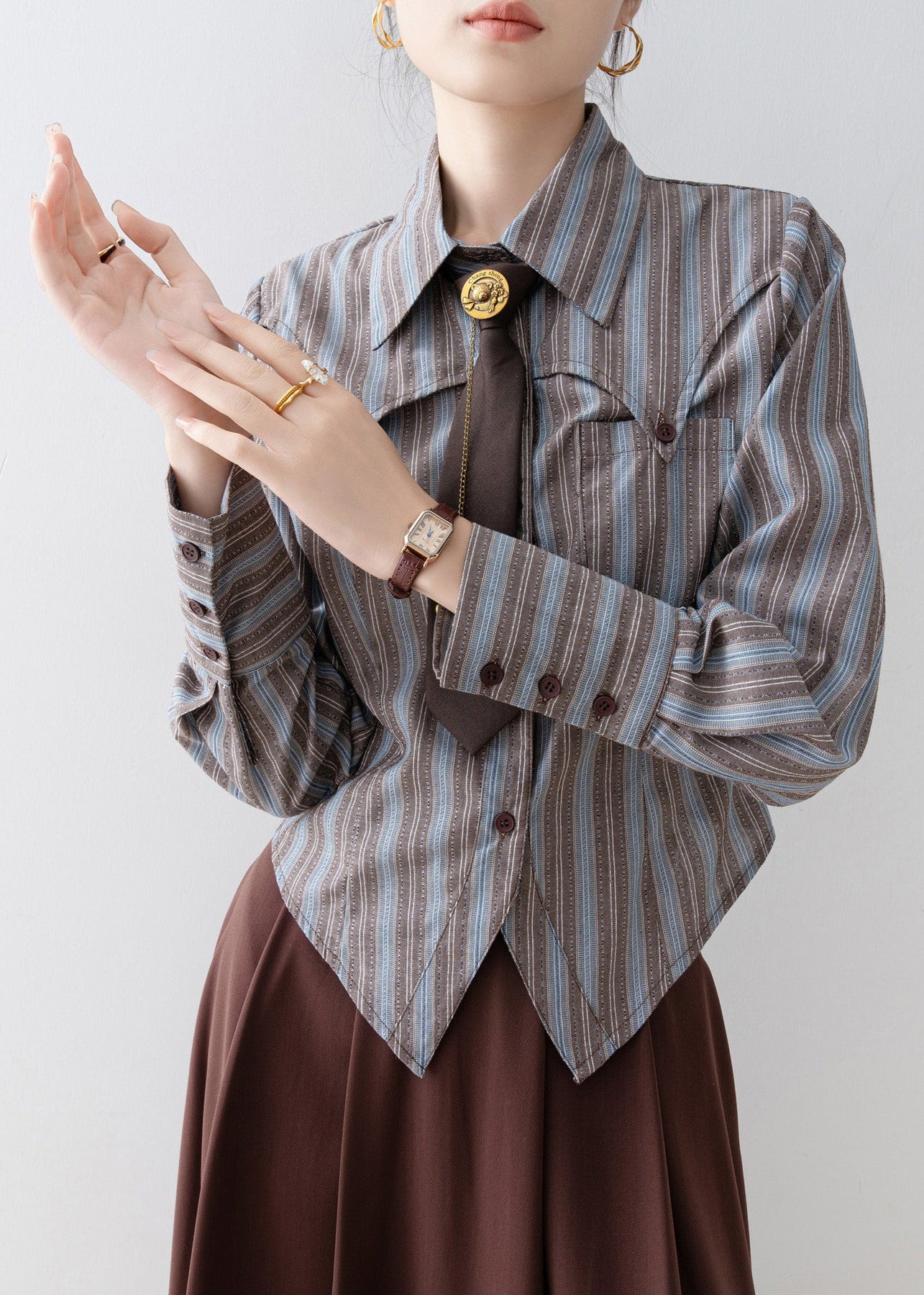 Chic Peter Pan Collar Striped Cotton Shirts Top Spring