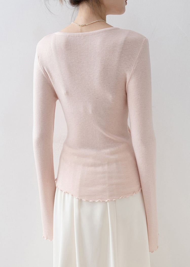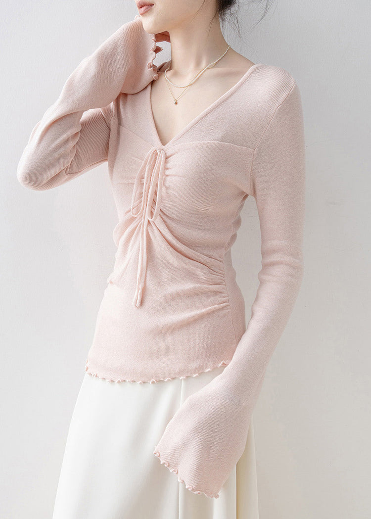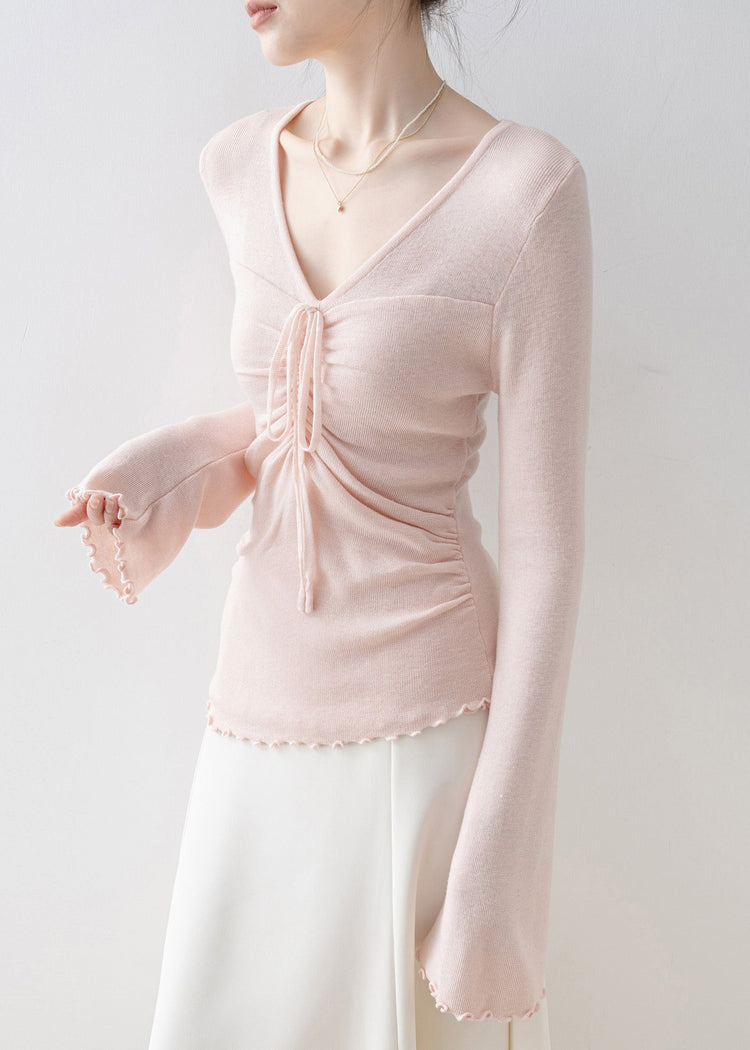 Fashion Pink V Neck Bow Knit Top Flare Sleeve