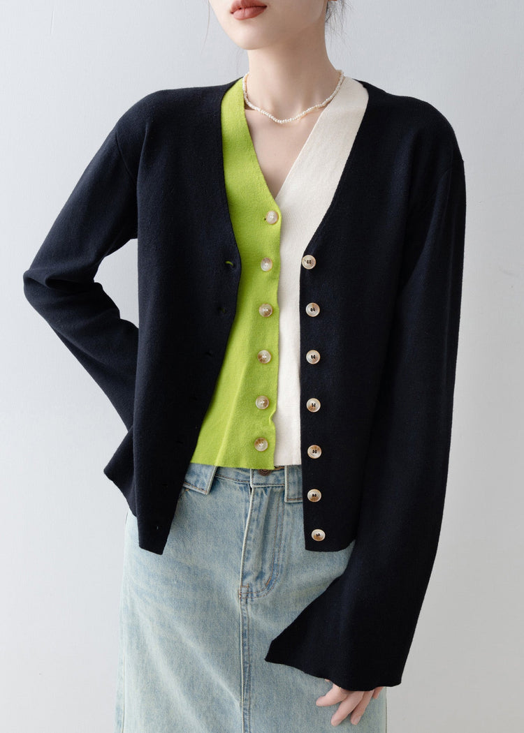 Italian Black V Neck Patchwork False Two Pieces Knit Cardigan Spring