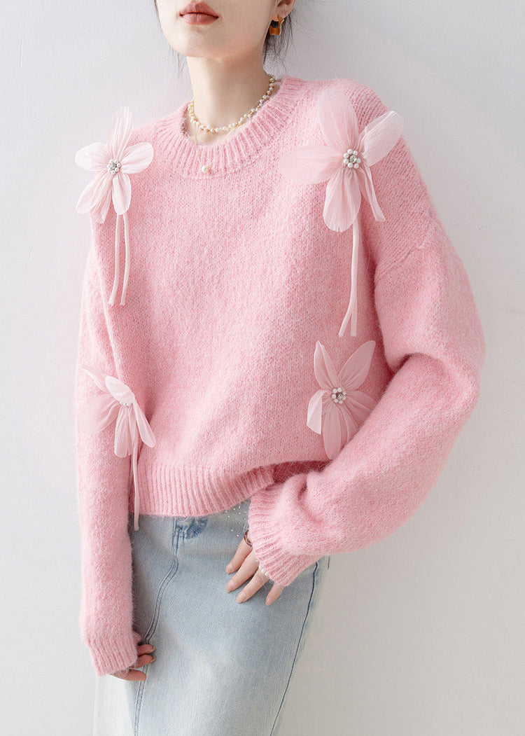 Loose Pink O Neck Nail Bead Knit Sweaters Spring