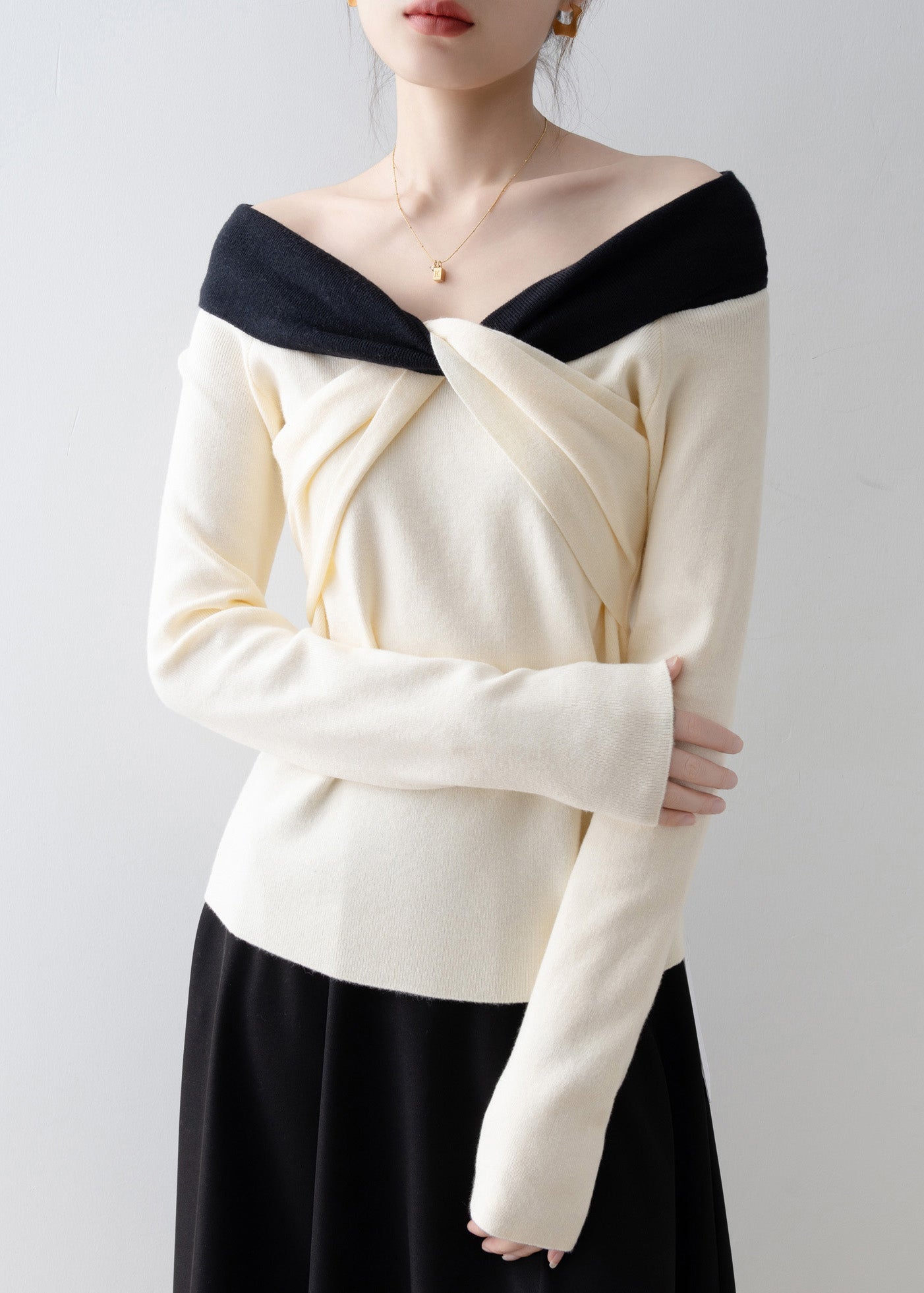 2025 New Beige Slash Neck Slim Cross Knit Top Spring