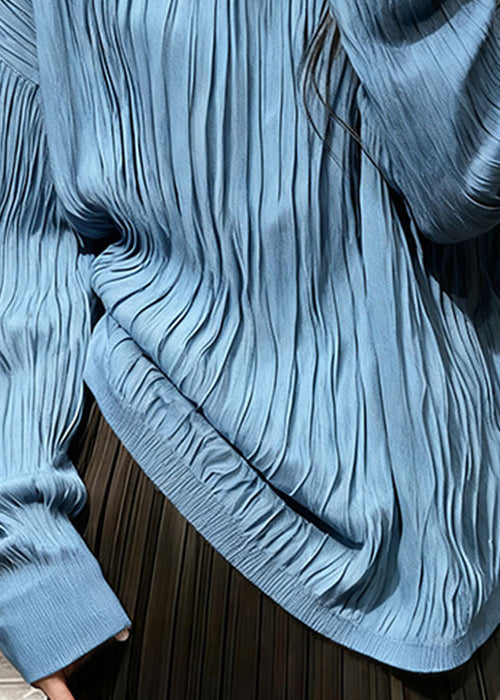 Blue Wrinkled Cozy Cotton T Shirt Top O Neck Long Sleeve