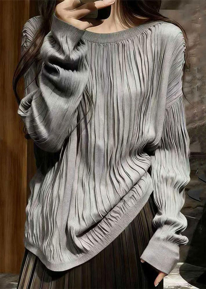 Simple Grey O Neck Wrinkled Solid Cotton T Shirts Spring