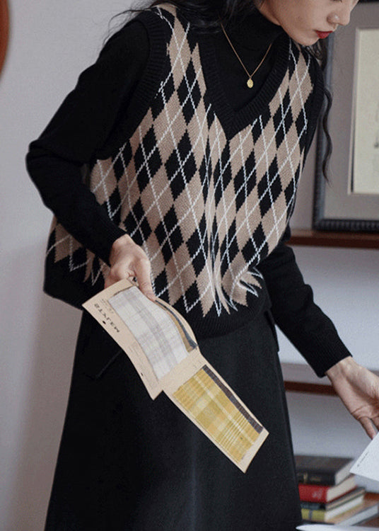 Fashion Black V Neck Geometric Print Knit Vest Sleeveless