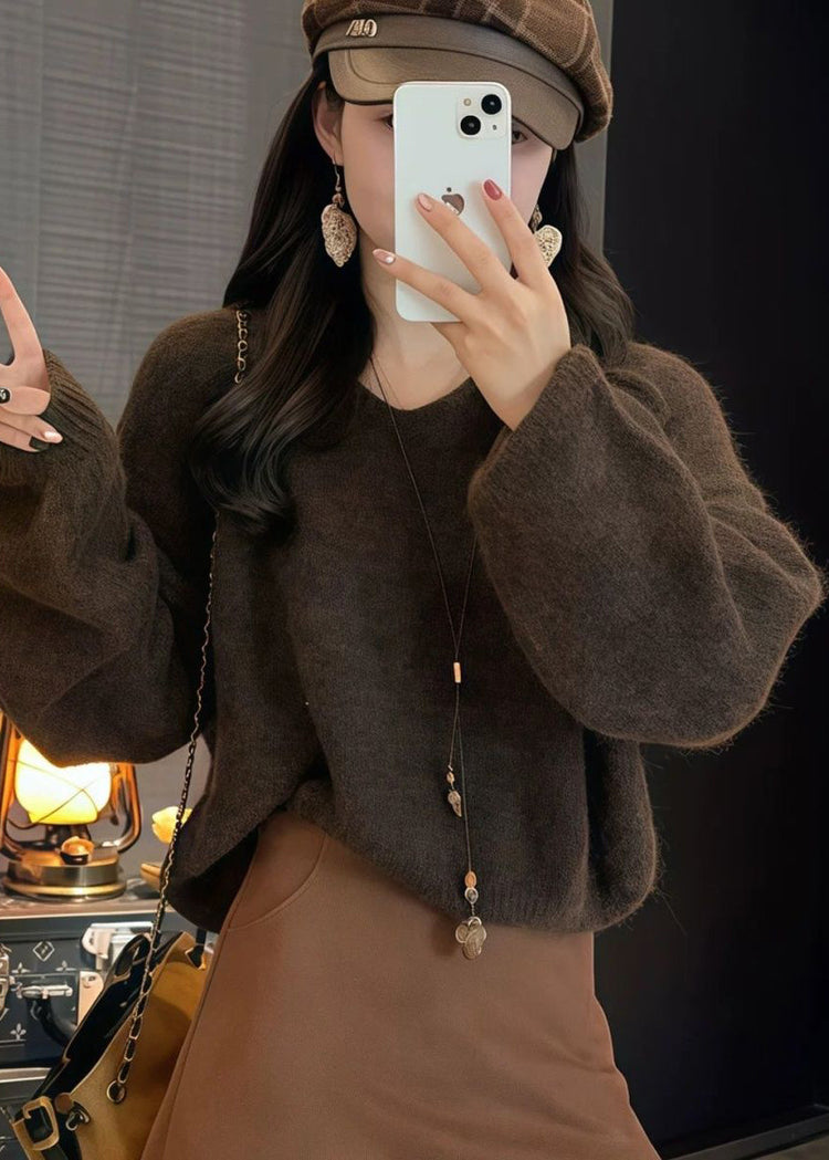 French Orange V Neck Knit Sweaters Top Spring