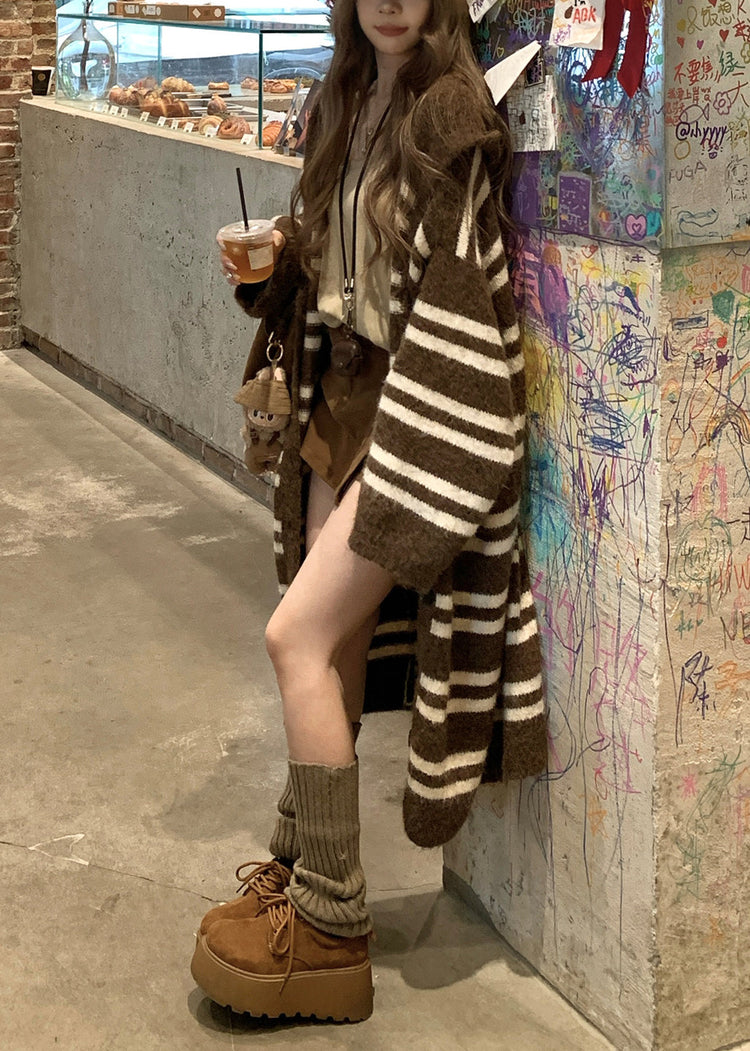 Loose Coffee Striped Patchwork Knit Long Cardigan Spring