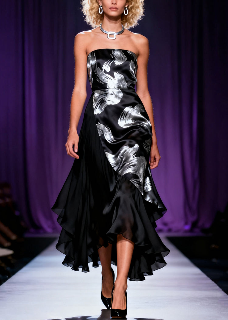 French Black Cold Shoulder Print Chiffon Patchwork Party Dress Sleeveless