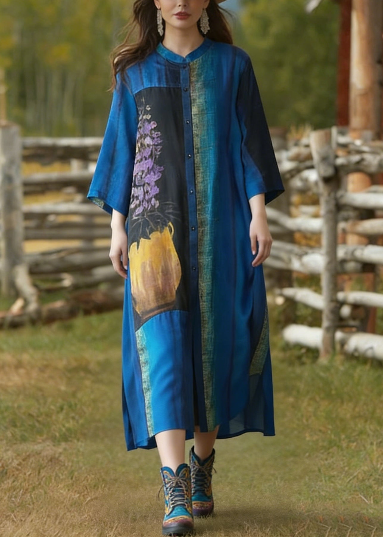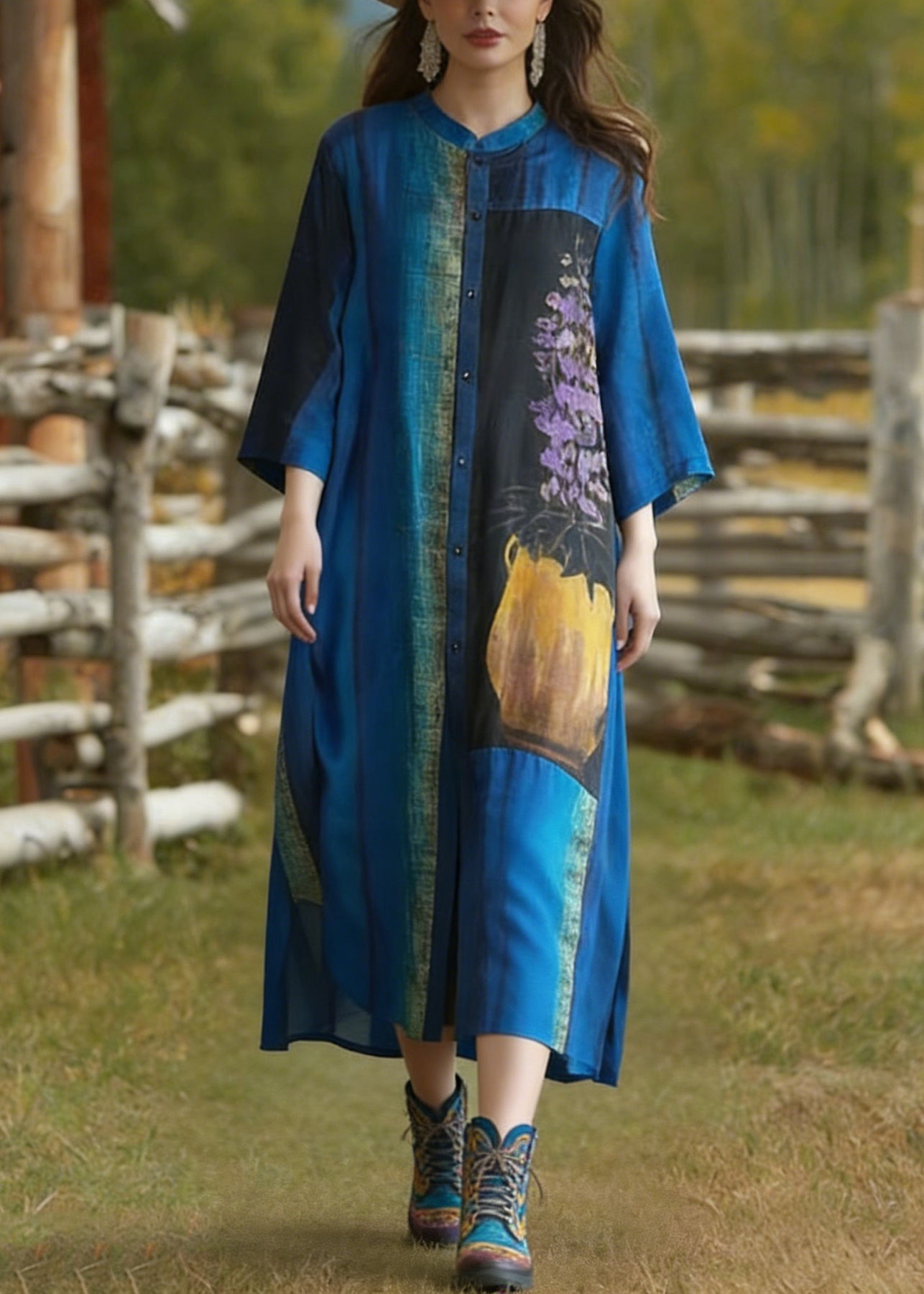 Loose Blue Stand Collar Button Print Silk Cardigans Summer