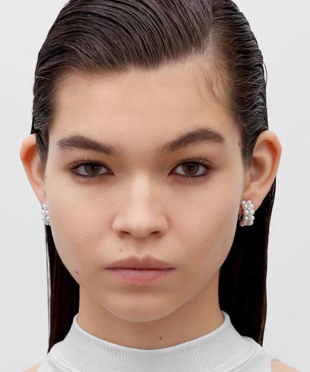 Elegant White Sterling Silver Zircon Double-Layer Pearl Hoop Earrings
