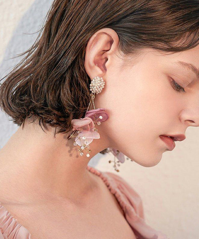 Holiday Style Tulle Flower Pearl Stud Earrings