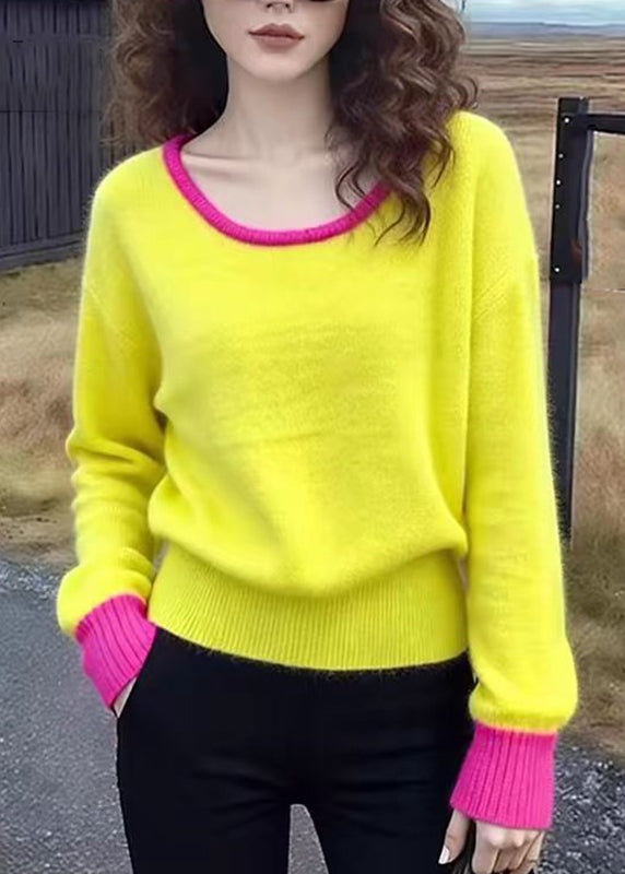 Cute Yellow O-Neck Patchwork Cotton Knit Sweater Spring