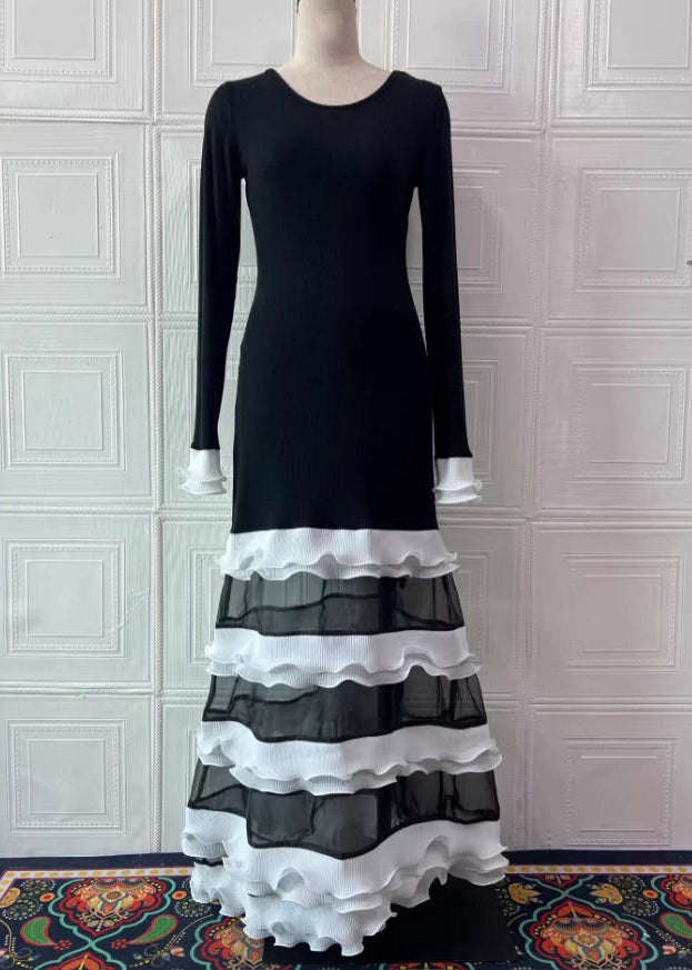 Organic Black White Striped O-Neck Ruffled Knit Patchwork Tulle Long Dress Spring