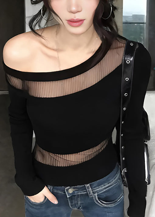Simple Black One Shoulder Patchwork Tulle Shirt Tops Summer