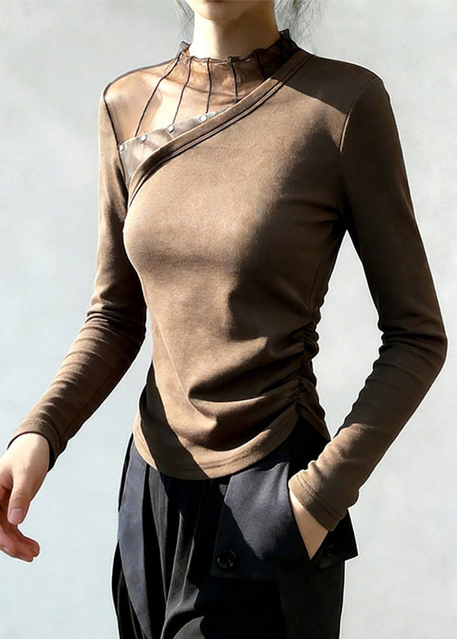 Women Brown Stand Collar Patchwork Wrinkled Cotton Blouse Top Spring